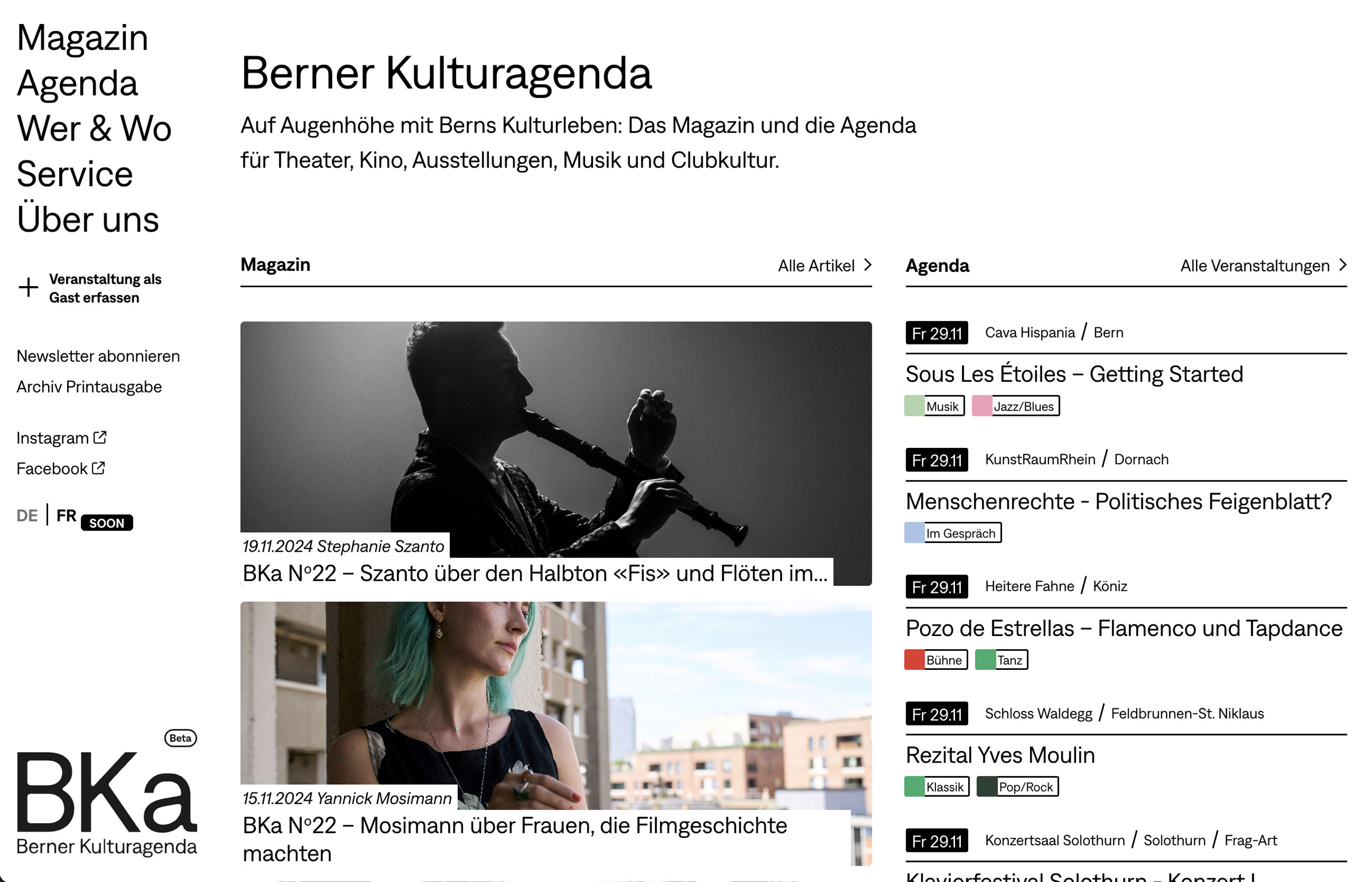 Nous avons développé pour BKA · Berner Kulturagenda une plateforme culturelle robuste, combinant agenda numérique, magazine et support aux organisateurs. L’architecture optimisée et le design responsive assurent une navigation fluide entre événements, articles et organisations. Grâce à un back-office performant, les contenus sont facilement gérables, tout en renforçant la visibilité du panorama culturel bernois.