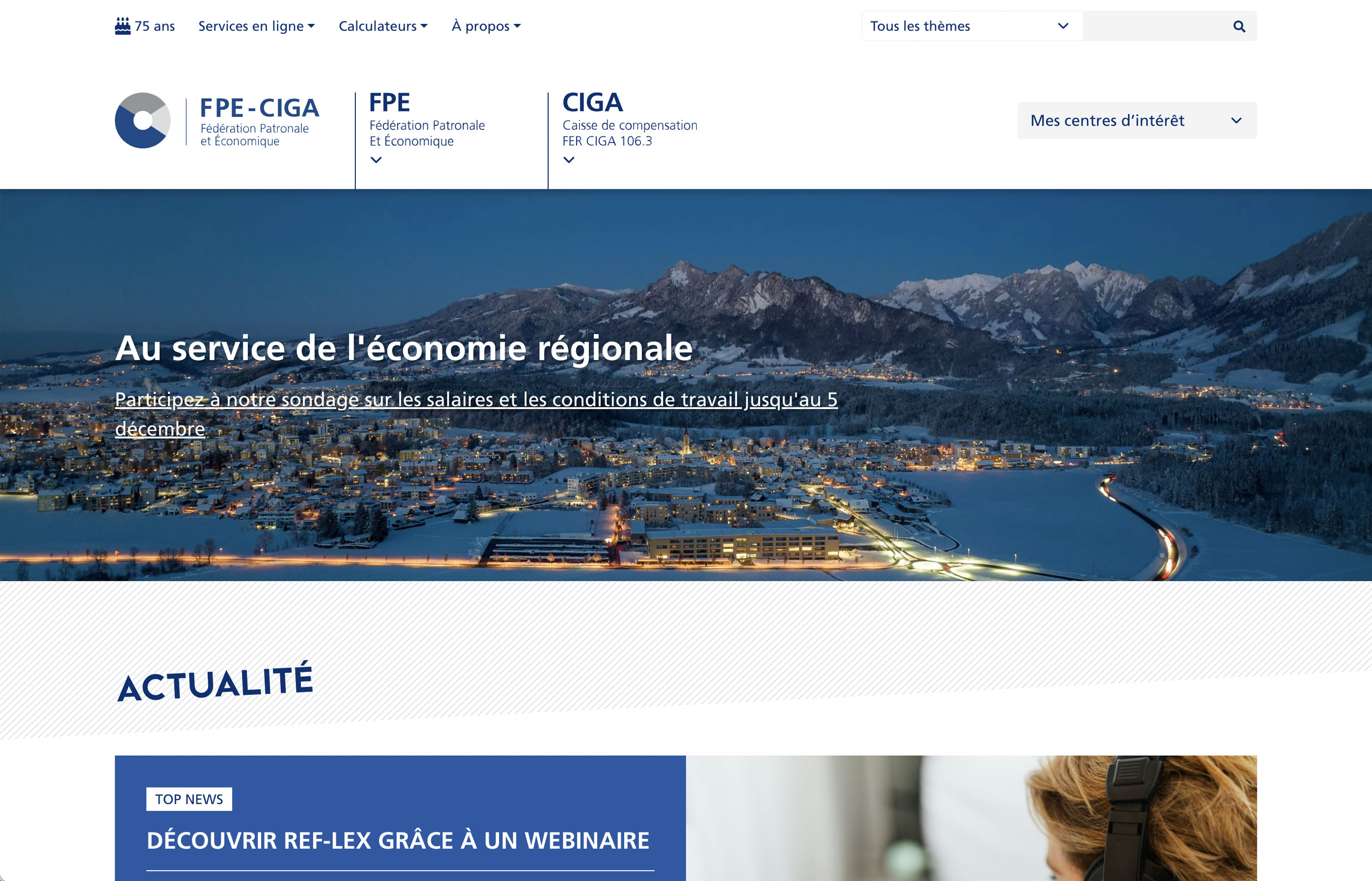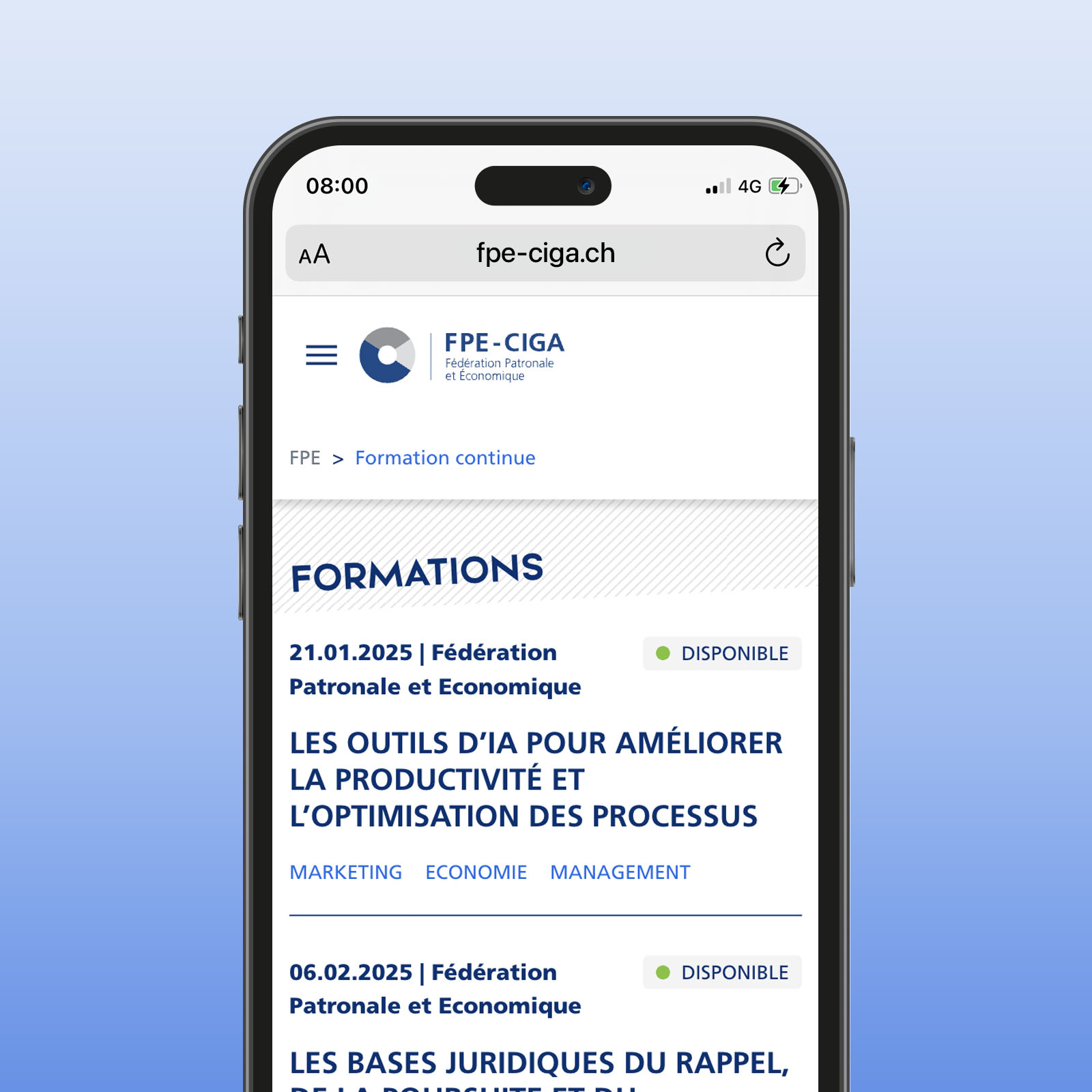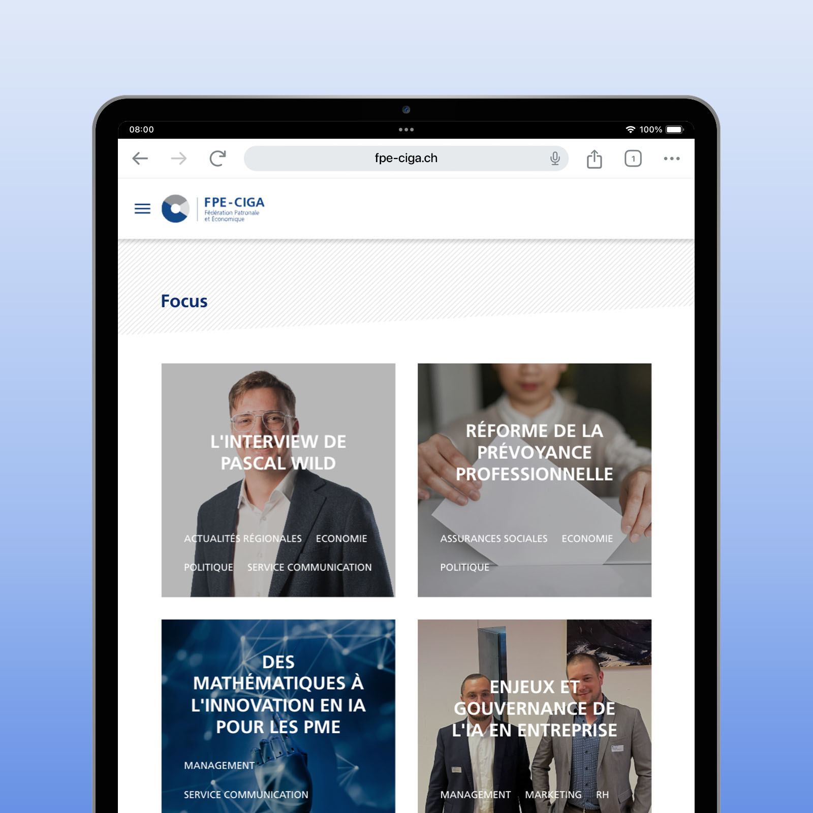 Nous avons développé pour la FPE-CIGA, fédération patronale engagée dans la valorisation de l’économie régionale, un site complet et structuré, qui centralise les services aux membres (e-services, formation, juridique, assurances), les actualités et les événements. Grâce à une architecture optimisée, un design responsive et une navigation claire, la plateforme renforce la visibilité de la fédération, simplifie l’accès aux prestations pour les entreprises et associations locales et propose un outil de gestion des formations.