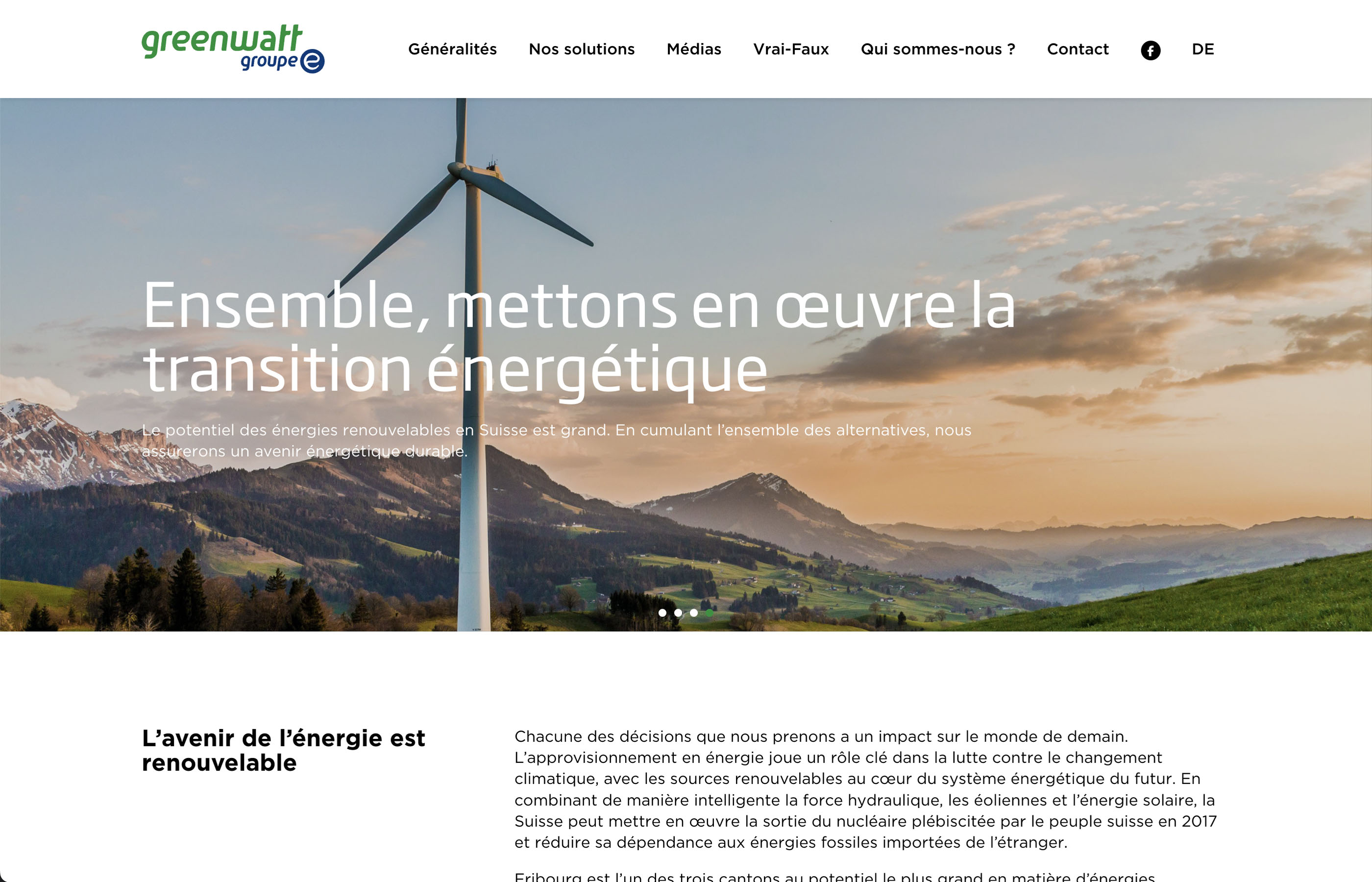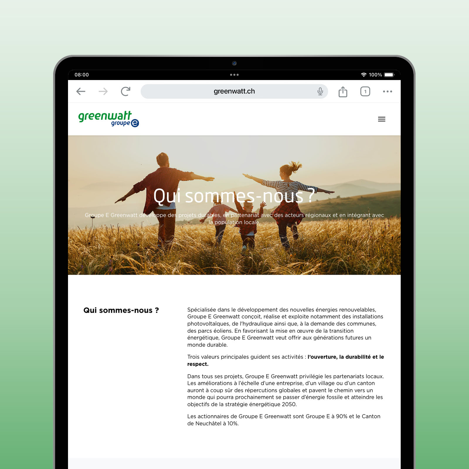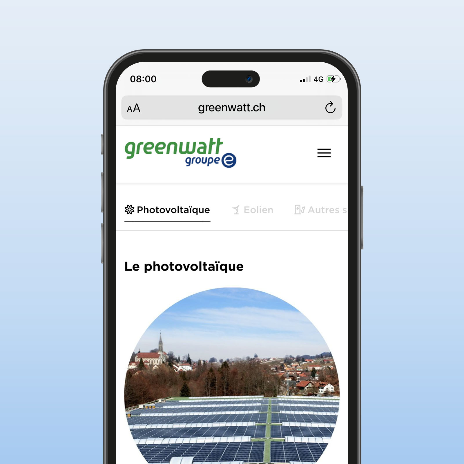Nous avons conçu pour Greenwatt, division du Groupe E spécialiste des énergies renouvelables, un site robuste et évolutif. L’architecture optimisée, le design responsive et les intégrations modulaires valorisent ses projets photovoltaïques, hydrauliques et éoliens. Le site offre une navigation fluide et une gestion de contenu simple pour assurer la visibilité et l’impact de son engagement dans la transition énergétique.